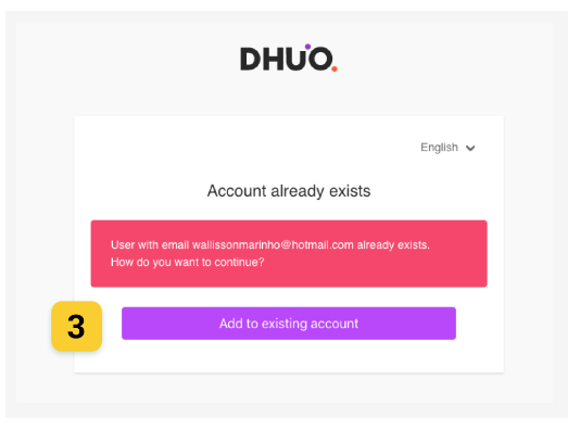 • Caso exista uma conta já cadastrada com o e-mail do Github ou Google, informaremos para que você possa vinculá-la ao DHuO;
