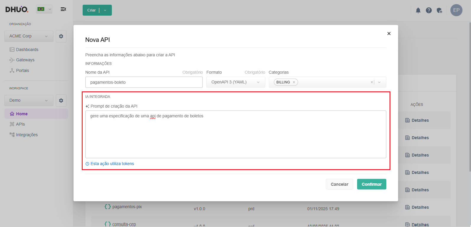 Agora você pode criar especificações de API usando linguagem natural! Basta descrever o que você precisa e deixe a IA gerar a especificação técnica automaticamente. Acesse Criar Nova API na plataforma, insira o prompt de criação e na sequência a especificação será gerada automaticamente. Assim diminuímos a barreira técnica por trás da especificação openAPI e trazemos agilidade e facilidade na criação de APIs.