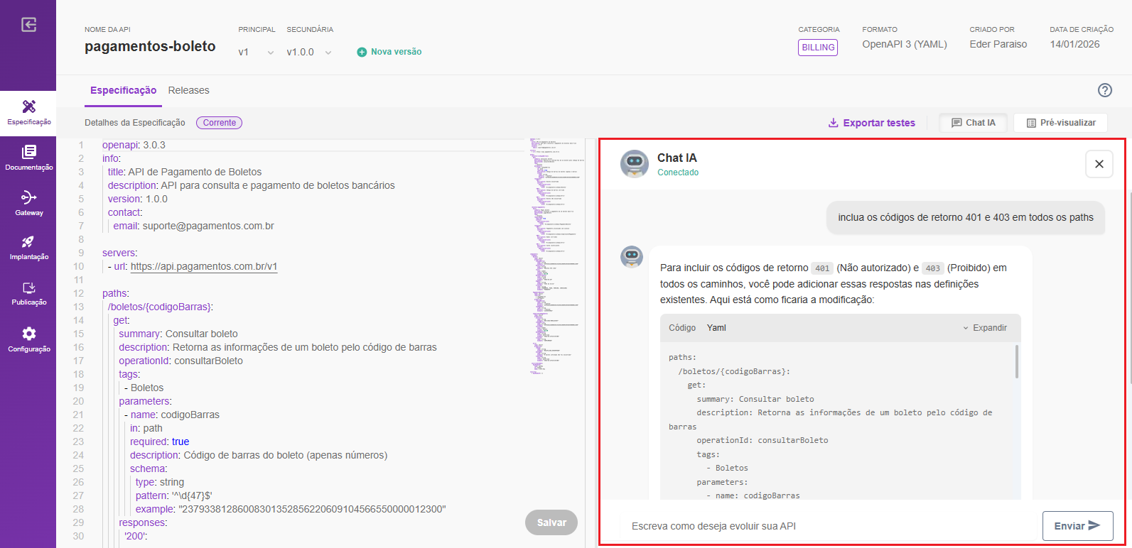 Disponibilizamos também o Chat IA para especificação de APIs, que pode ser utilizado para ajustar especificações existentes, tirar dúvidas sobre a API gerada, refinar endpoints e respostas, copiar trechos de especificação e obter exemplos de código para integração. Ele pode ser acessado na página da especificação da API, ao lado da ação Pré-visualizar.