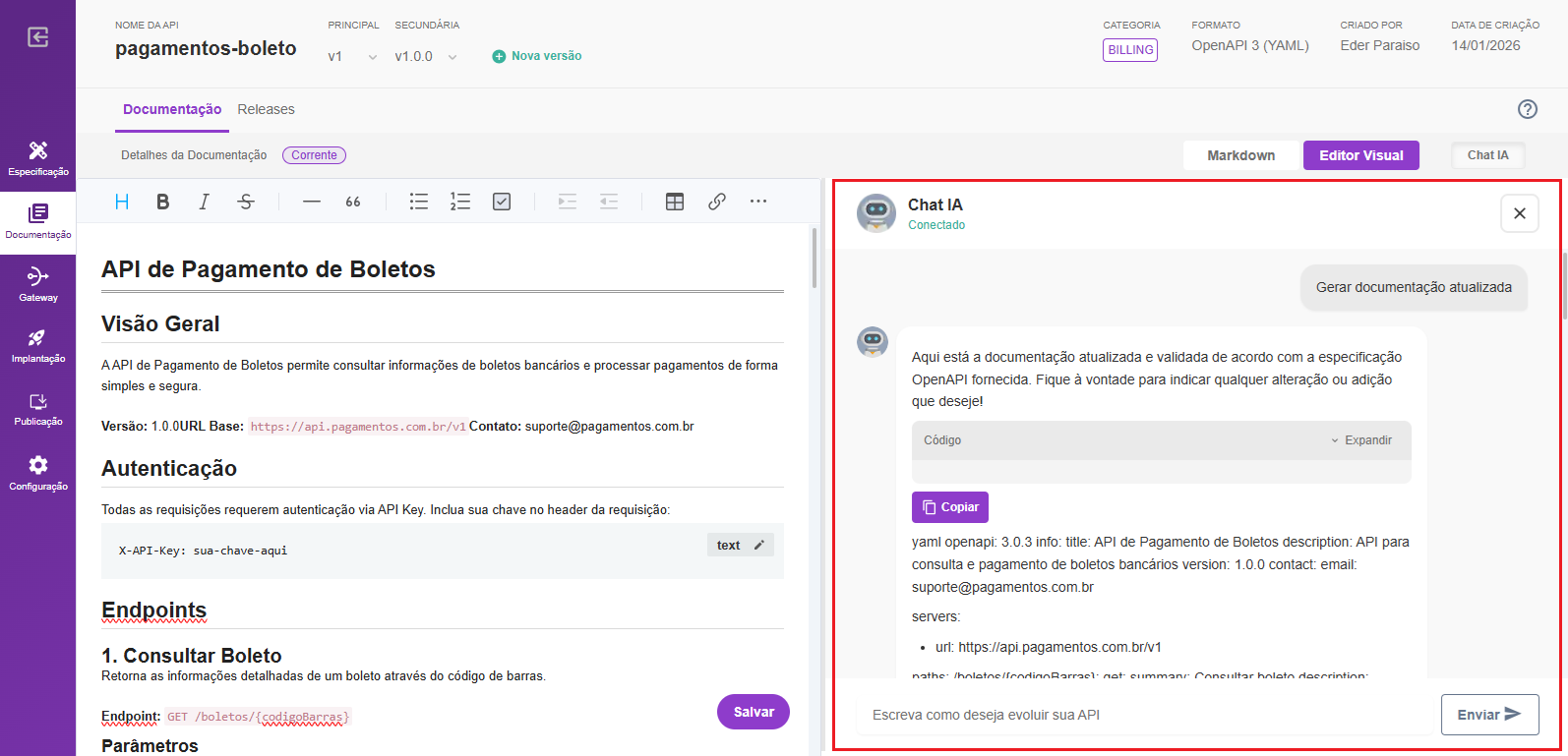 Assim, é possível manter a documentação sempre sincronizada com as mudanças mais recentes da API, evitando documentação desatualizada e economizando tempo na manutenção manual. Também disponibilizamos o Chat IA para documentações para auxiliar no refinamento da documentação com auxílio de IA generativa.