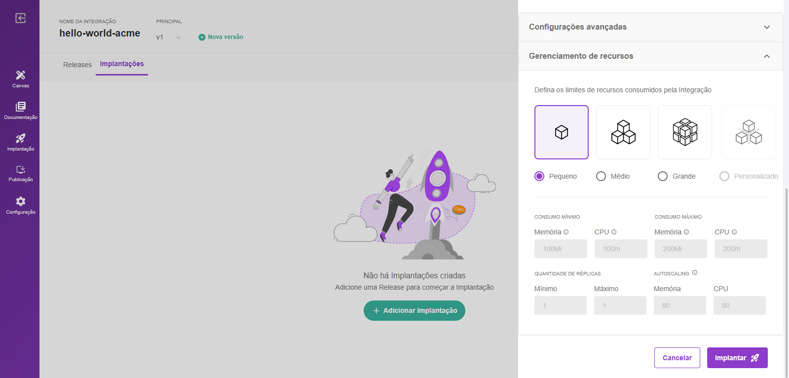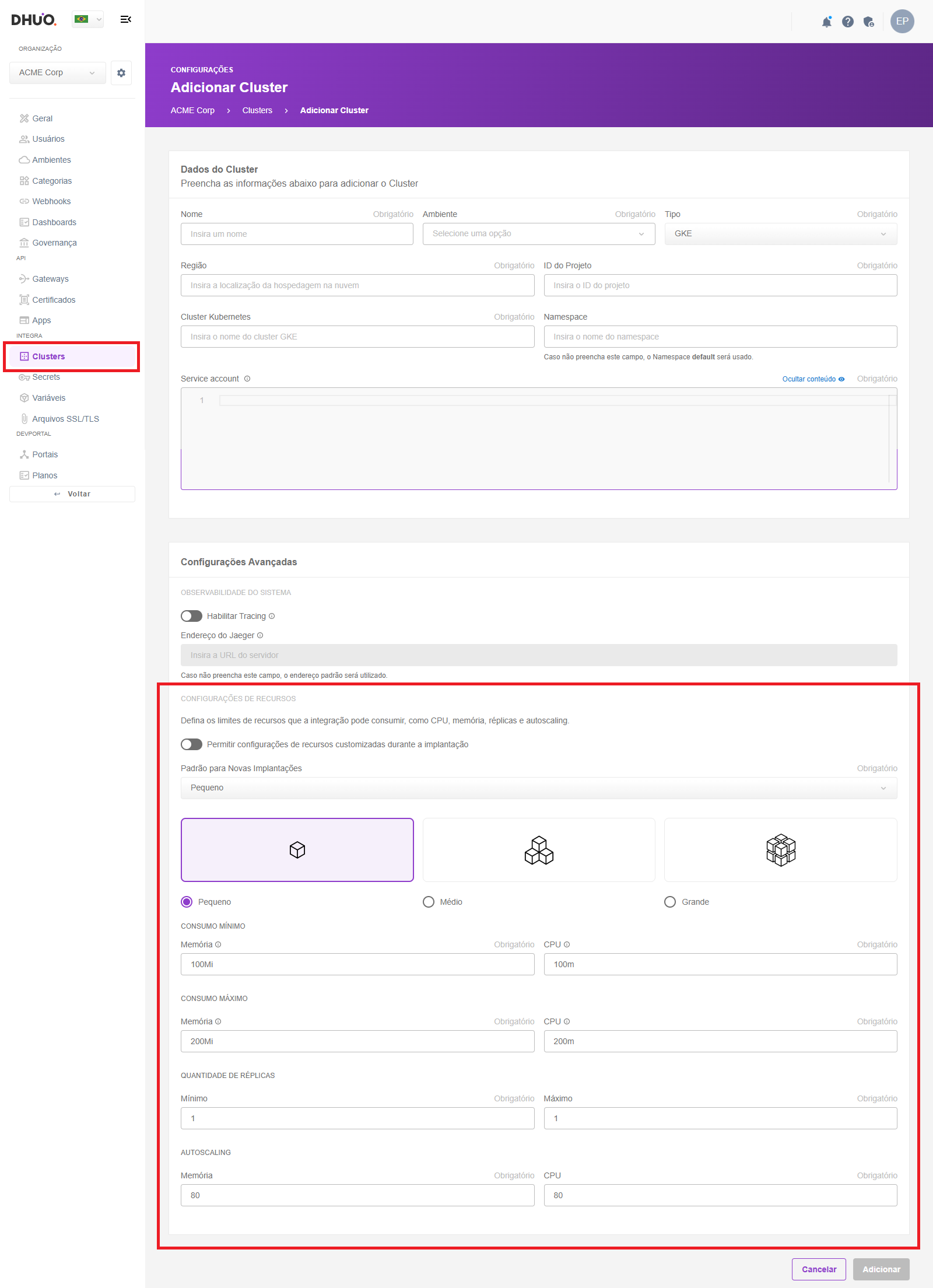 Adicionamos uma nova configuração no cadastro de clusters que permite determinar opções de limite de recursos computacionais consumidos por integrações implantadas nele. Dessa forma entregamos mais flexbilidade na configuração de recursos de acordo com cada ambiente abandonando os valores fixos da plataforma. No momento da implantação das integrações, serão apresentadas as configurações de cada categoria (pequeno médio e grande) de acordo com o cluster selecionado. Referente ao ticket DHEN-24.