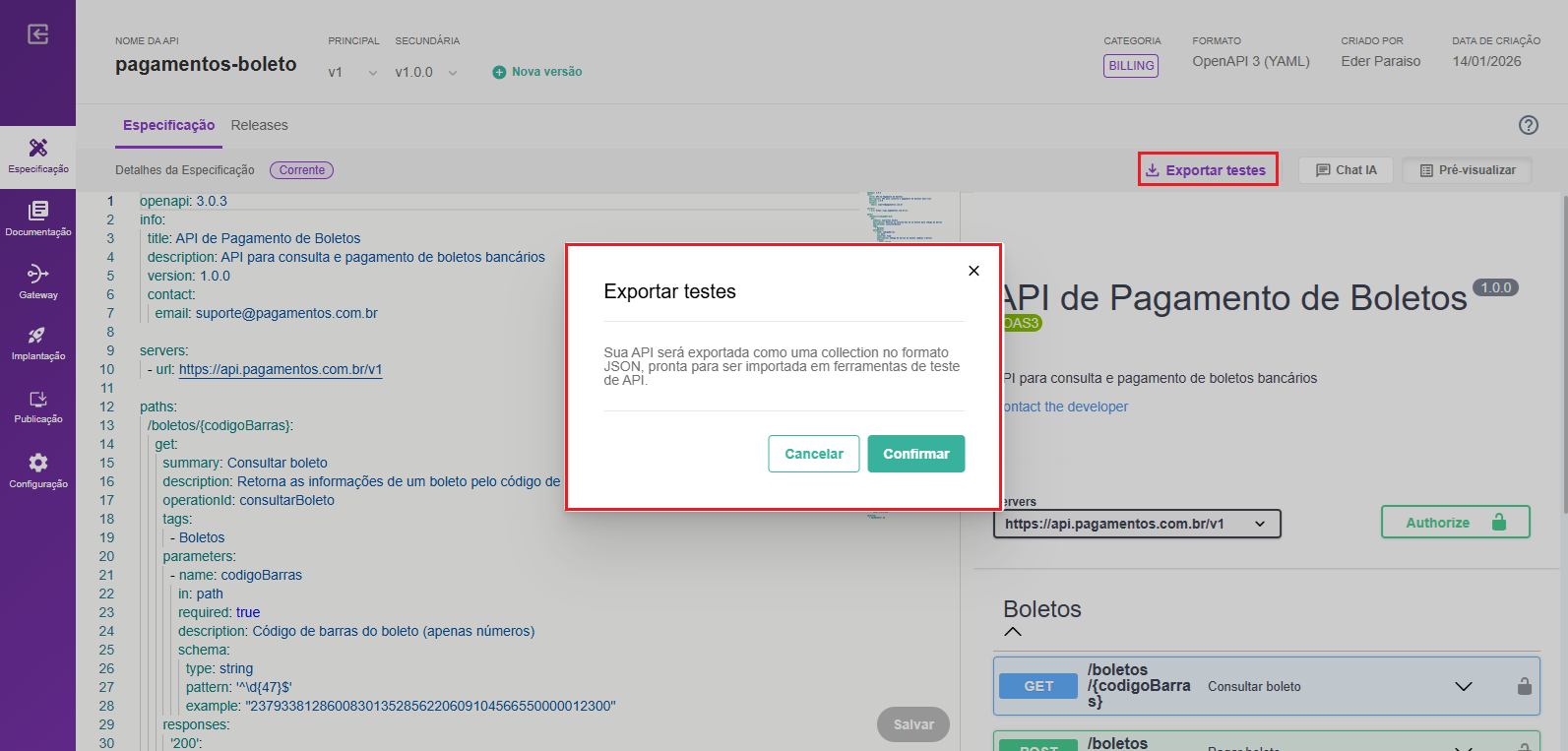 Agora você pode criar especificações de API usando linguagem natural! Basta descrever o que você precisa e deixe a IA gerar a especificação técnica automaticamente. Acesse Criar Nova API na plataforma, insira o prompt de criação e na sequência a especificação será gerada automaticamente. Assim diminuímos a barreira técnica por trás da especificação openAPI e trazemos agilidade e facilidade na criação de APIs.