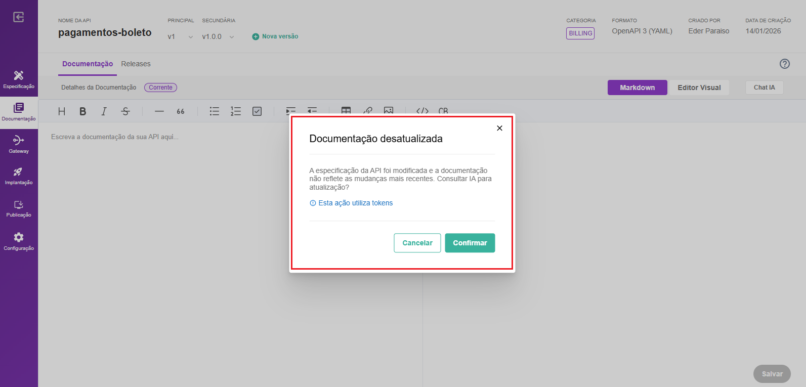 Assim, é possível manter a documentação sempre sincronizada com as mudanças mais recentes da API, evitando documentação desatualizada e economizando tempo na manutenção manual. Também disponibilizamos o Chat IA para documentações para auxiliar no refinamento da documentação com auxílio de IA generativa.